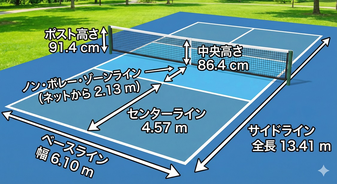 ピックルボールのコートのサイズとネットの高さは、以下の通り厳格に定められています。
